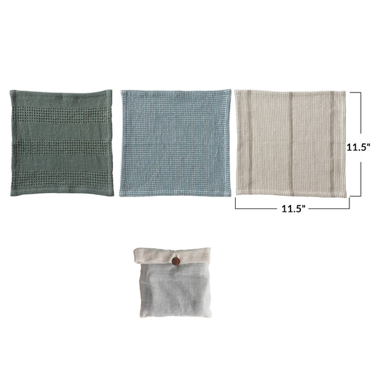 Cotton Waffle Weave Dish Cloths with Loop - Set of 3 in Bag - Multi Color