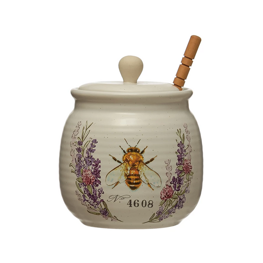 Stoneware Honey Jar with Bee Design and Wood Honey Dipper - 4.6-in