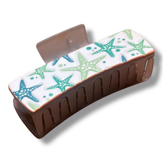Tooled Leather Hair Clip with Blue and Green Starfish - 4-in