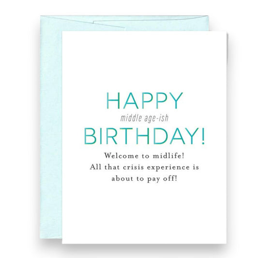 "HAPPY middle age-ish BIRTHDAY! Welcome to Midlife! All That Crisis Experience is About to Pay Off!" - Birthday Greeting Card