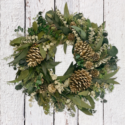 Eucalyptus Winter Wreath With Gold Accent Pine Cones - 18-in