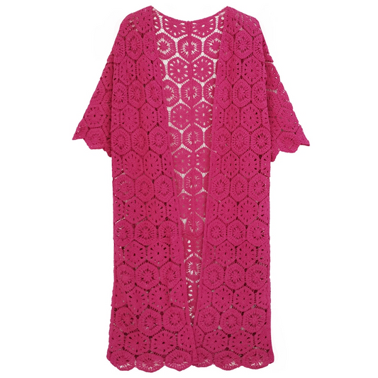 Geometric Pattern Crochet Cardigan Poncho Cover-Up - Berry