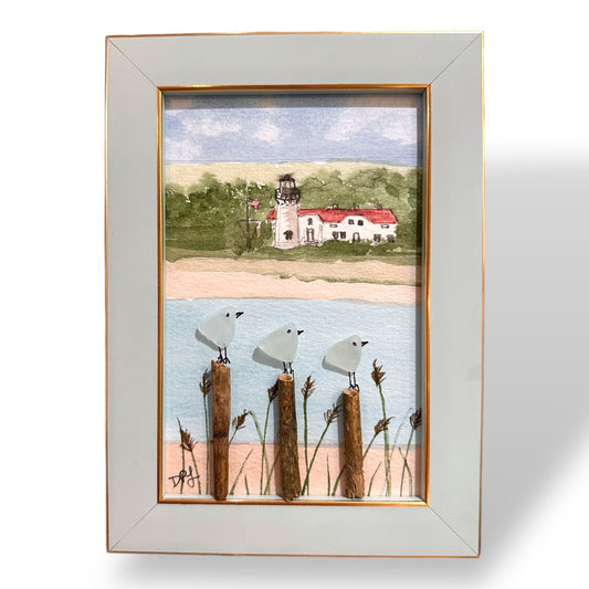 Chatham Lighthouse Cape Cod Massachusetts Sea Glass Birds on Watercolor Print - Framed - 7-1/2-in (Copy)