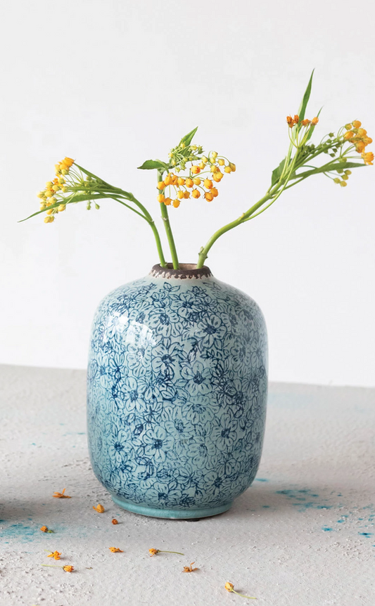 Terracotta Vase With Floral Pattern - Distressed Blue - 6.5-in
