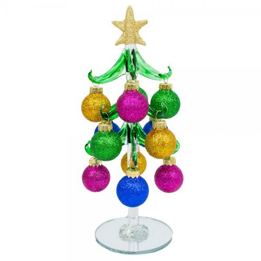 Green Glass Tree with Jewel Tone Ornaments - 8-in