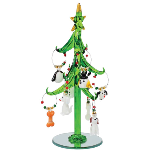 Green Glass Tree with Dog Wine Charms - 8-in