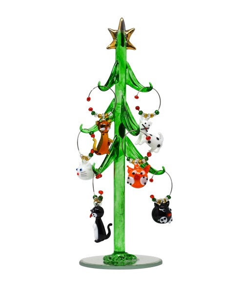 Green Glass Tree with Cat Wine Charms - 8-in