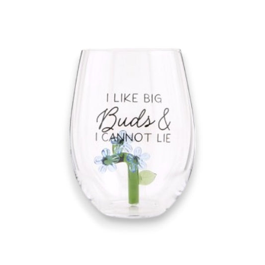 I Like Big Buds & I Cannot Lie - Stemless Wine Glass With Blown Glass Blue Flower