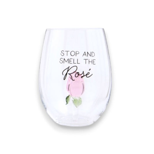 Stop and Smell The Rosé - Stemless Wine Glass With Pink Blown Glass Rose - 16-oz