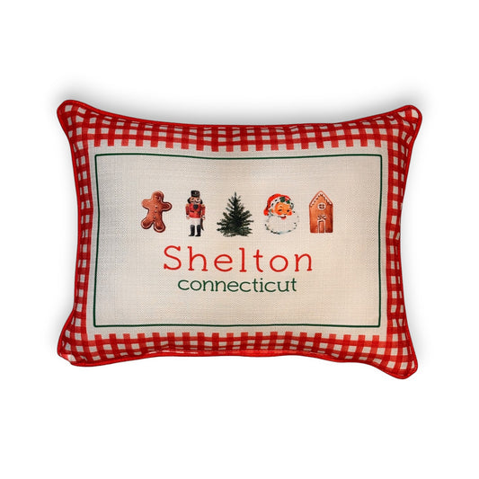 Gingham Christmas Hometown Pillow - Shelton Connecticut - Red Piping - 19-in