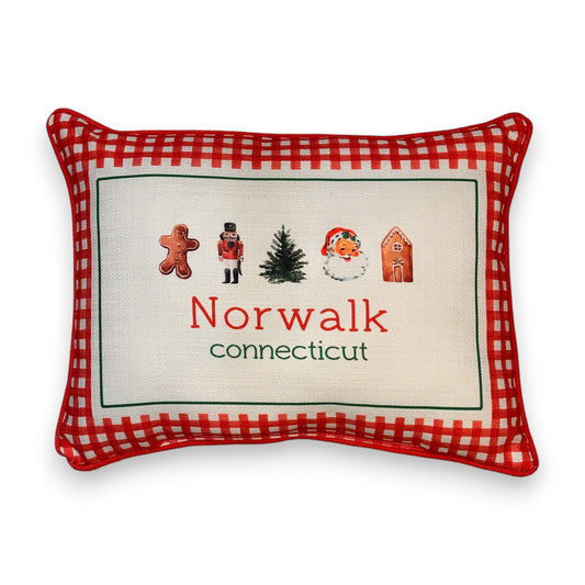 Gingham Christmas Hometown Pillow - Norwalk Connecticut - Red Piping - 19-in