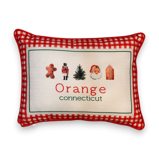 Gingham Christmas Hometown Pillow - Orange Connecticut - Red Piping - 19-in