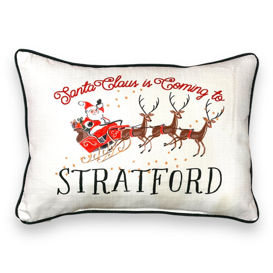 Santa Claus Is Coming To Stratford - Throw Pillow with Evergreen Piping - 19-inch