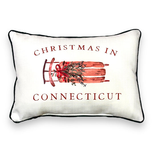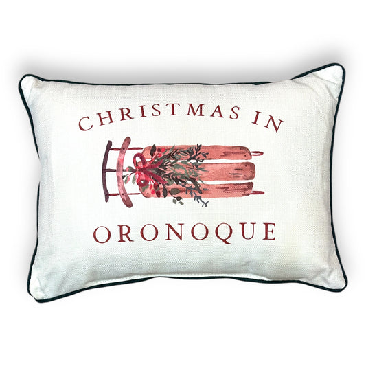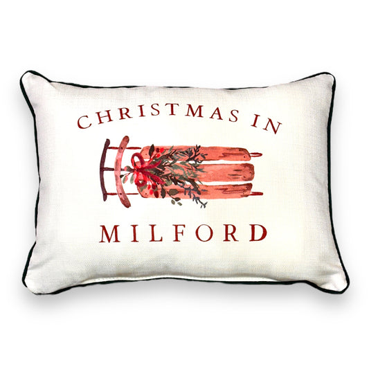 CUSTOM Christmas In (Your City/Town) - Sled Print Throw Pillow with Evergreen Piping - 19-inch