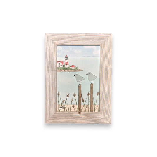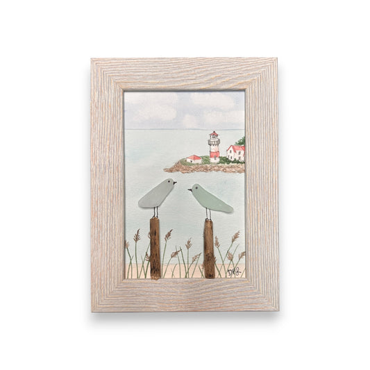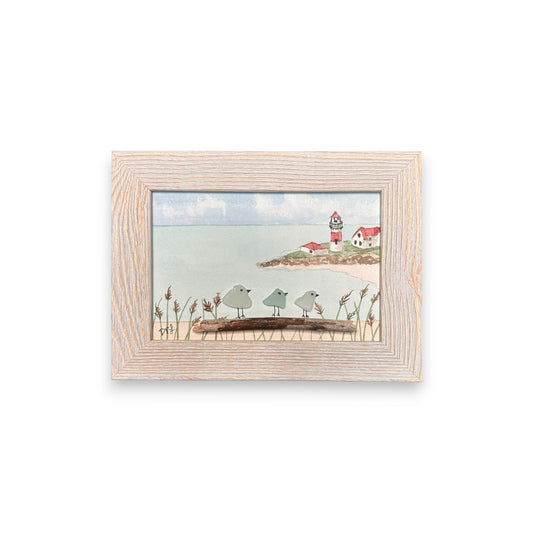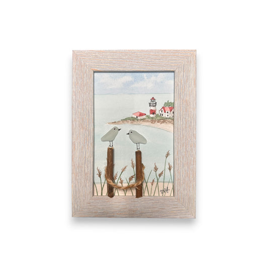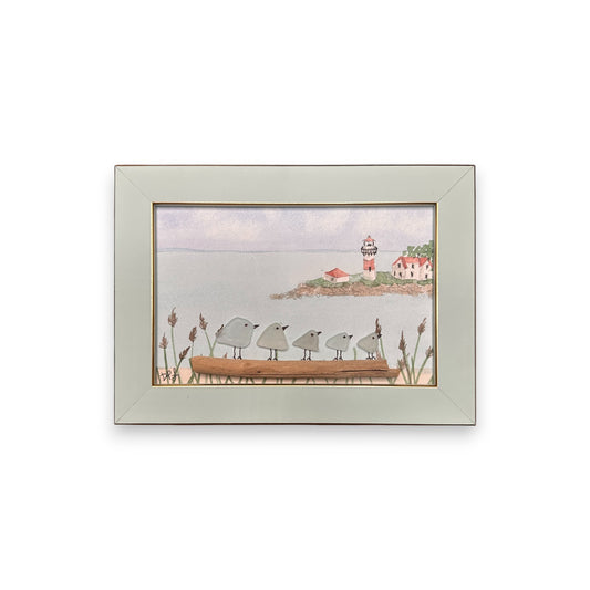 Stratford Point Lighthouse Sea Glass Birds on Watercolor Print - Framed White Wash -7-1/4-in