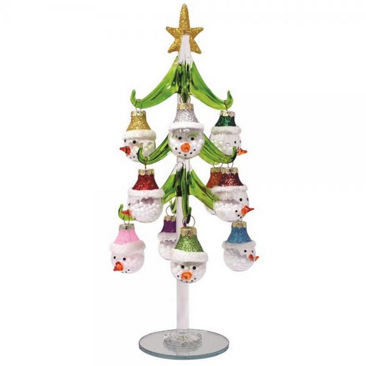 Green Glass Tree With 12 Snowman Ornaments - 10-in