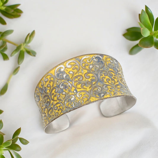 Yellow Floral Scrollwork - Brass Patina Adjustable Cuff Bracelet