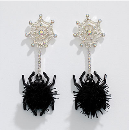 Black Spiders + Pom Poms Halloween Earrings