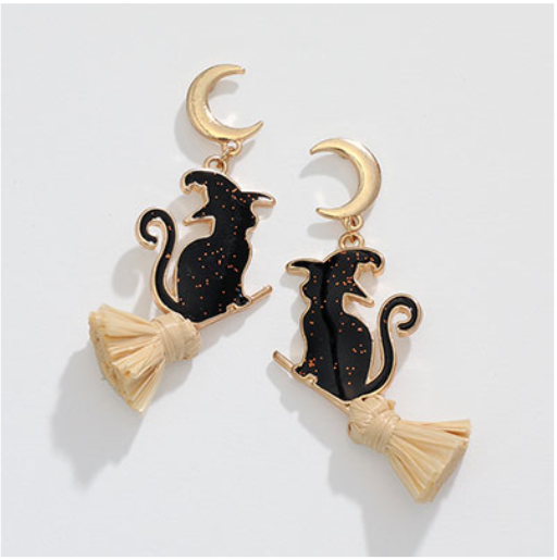 Black Cats on Brooms Halloween Earrings