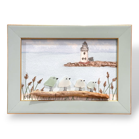Chatham Lighthouse Cape Cod Massachusetts Sea Glass Birds on Watercolor Print - Framed - 7-1/2-in (Copy)