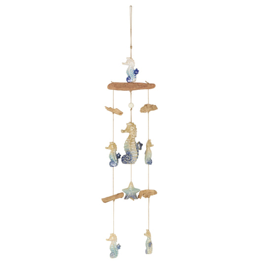 Blue Ceramic Sea Horse Ombre Windchime with Driftwood and Hanging Sea Horse Accents