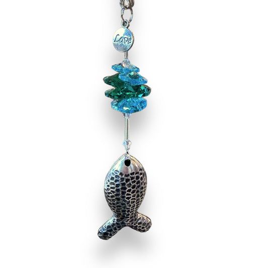 Fish Live Hammered Metal with Turquoise and Green Crystals - Suncatcher
