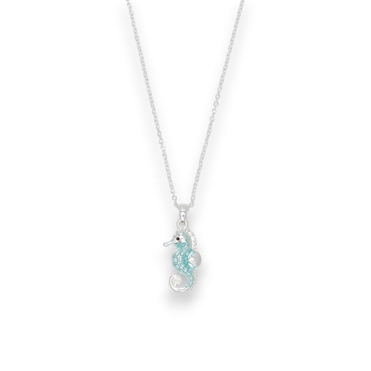 Silver Sea Horse In Clear Aqua - Necklace
