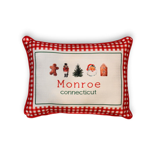 Gingham Christmas Hometown Pillow - Monroe Connecticut - Red Piping - 19-in