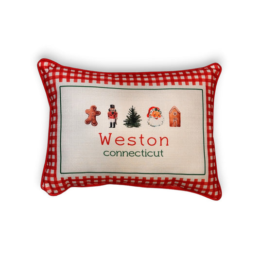 Gingham Christmas Hometown Pillow - Weston Connecticut - Red Piping - 19-in