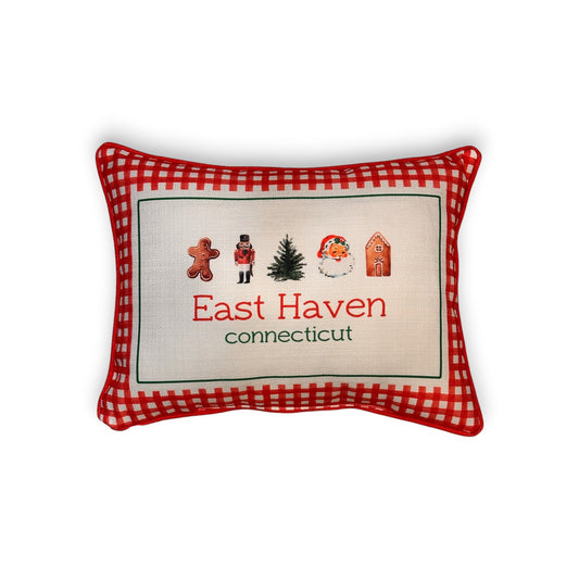 Gingham Christmas Hometown Pillow - East Haven Connecticut - Red Piping - 19-in