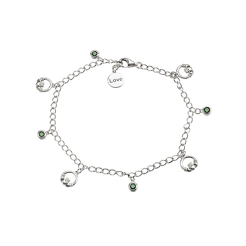 • This Sterling Silver Irish Claddagh Bracelet with Emerald Green Cubic Zirconia Charms strengthens close connections.