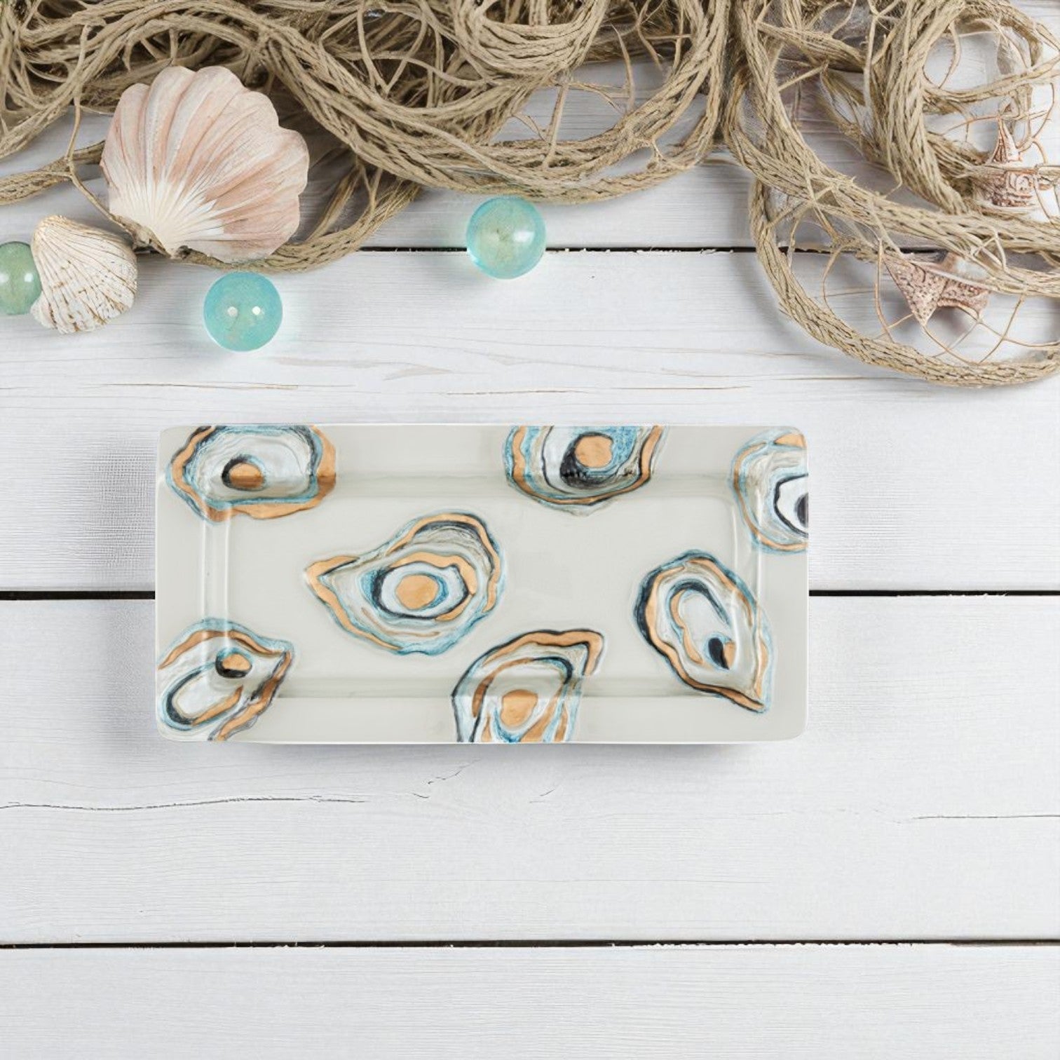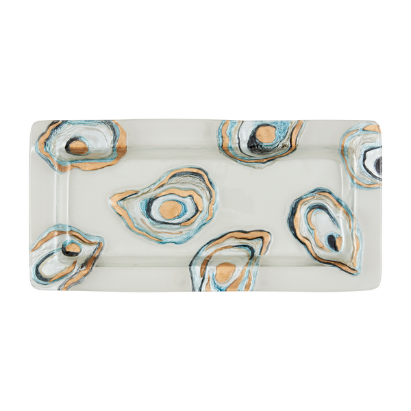 Elevate your dining experience with the Oyster Hand Painted Glass Platter! The platter is made of clear glass, while the oysters feature gold, blue, and black accents. Measures 7.25in x 15in. Hand wash only.