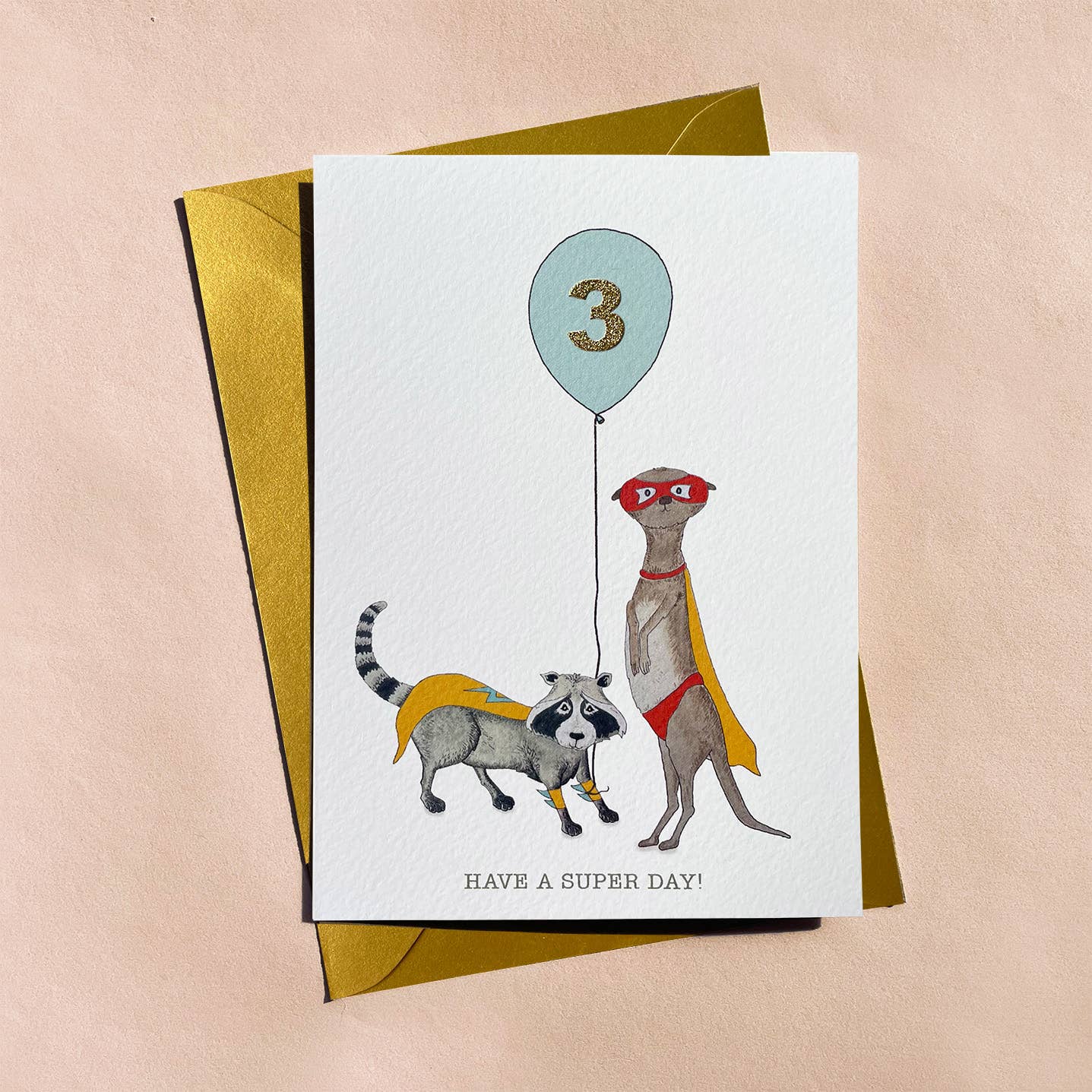 - A fun animal birthday card featuring an illustrated superhero meerkat and raccoon with a gold number in the balloon for bringing some added party fun and sparkle.
