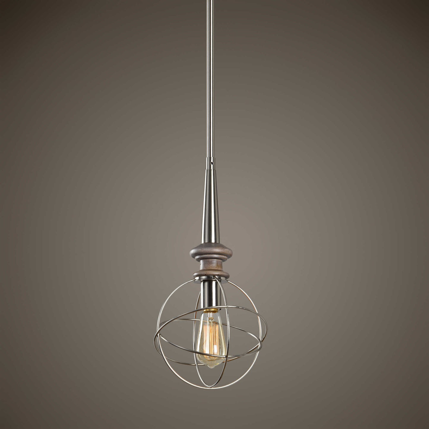 - A transitional rod hung mini pendant in brushed nickel features a sphere head with a washed grey driftwood spindle.