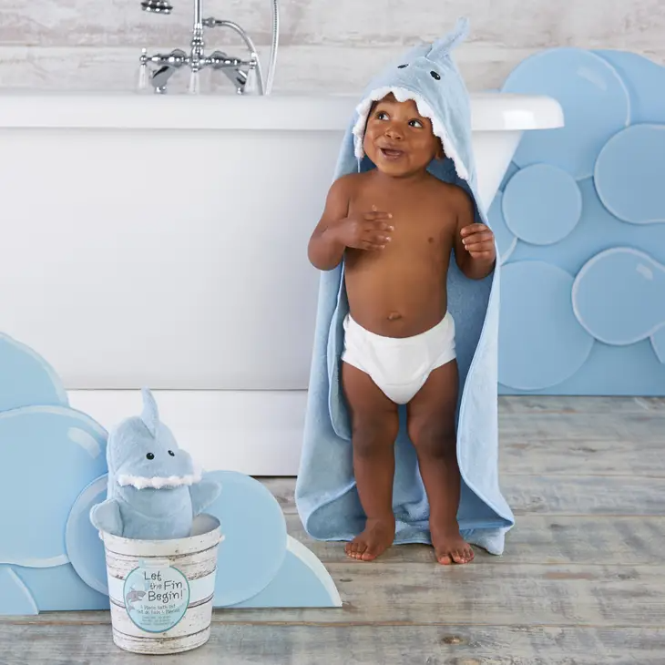 - Four-piece bath gift set features soft gray terry hooded towel with smiling shark's face and 3-D accents including teeth, fin and tail; soft shark bath mitt with black appliqued eyes and 3-D features; and two spa slippers with sea gray shark appliques