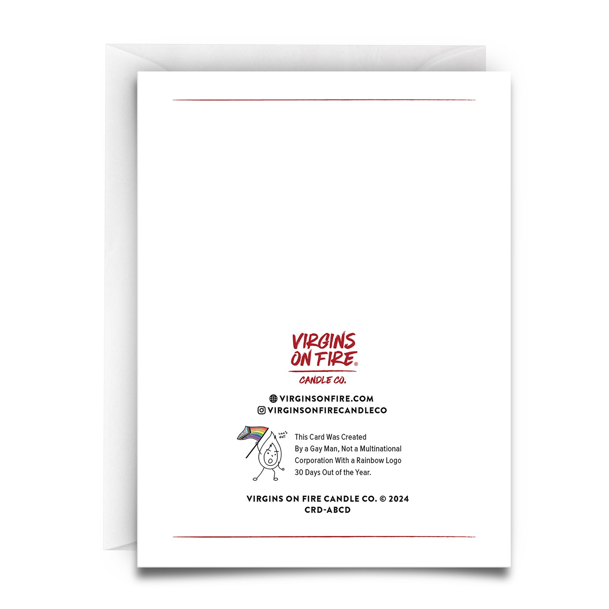The back of the card includes the phrase, "This card was created by a gay man, not a multinational corporation with a rainbow logo 30 days out of the year." From Virgins On Fire Candle Co, a gay-owned business in Brooklyn, NY