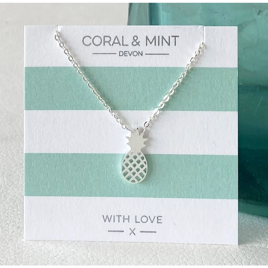 Pineapple Necklace presented on a mint striped card within a white gift box.