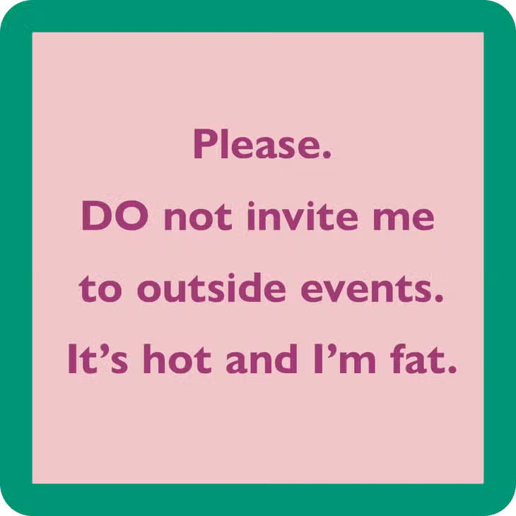 - "Please. DO not invite me to outside events. It's hot and I'm fat"