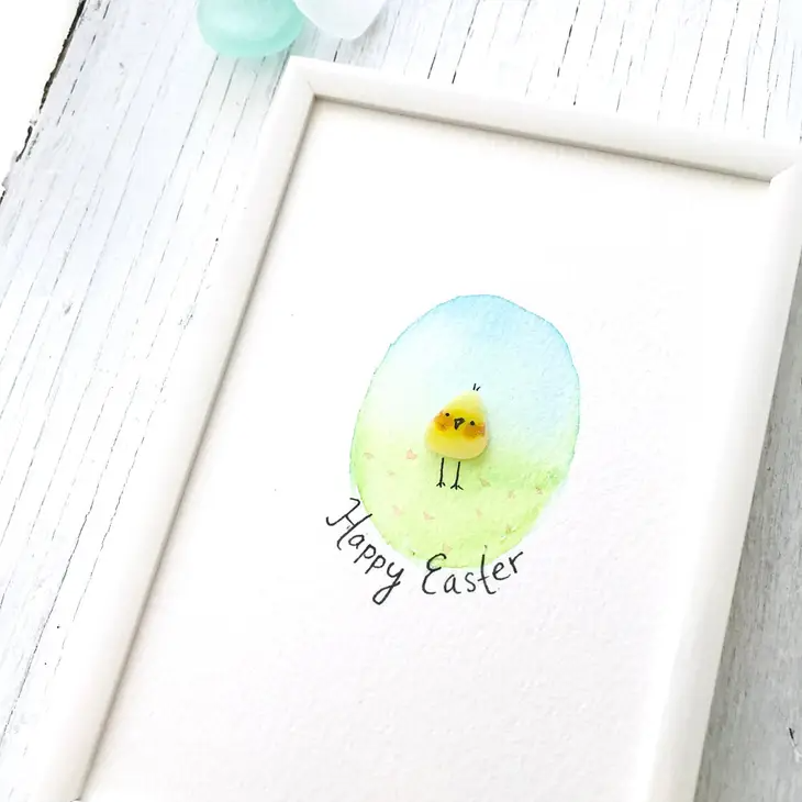 • Original sea glass artwork featuring an adorable Easter chick made out of clear glass (that is painted yellow on one side) with a charming watercolor background.