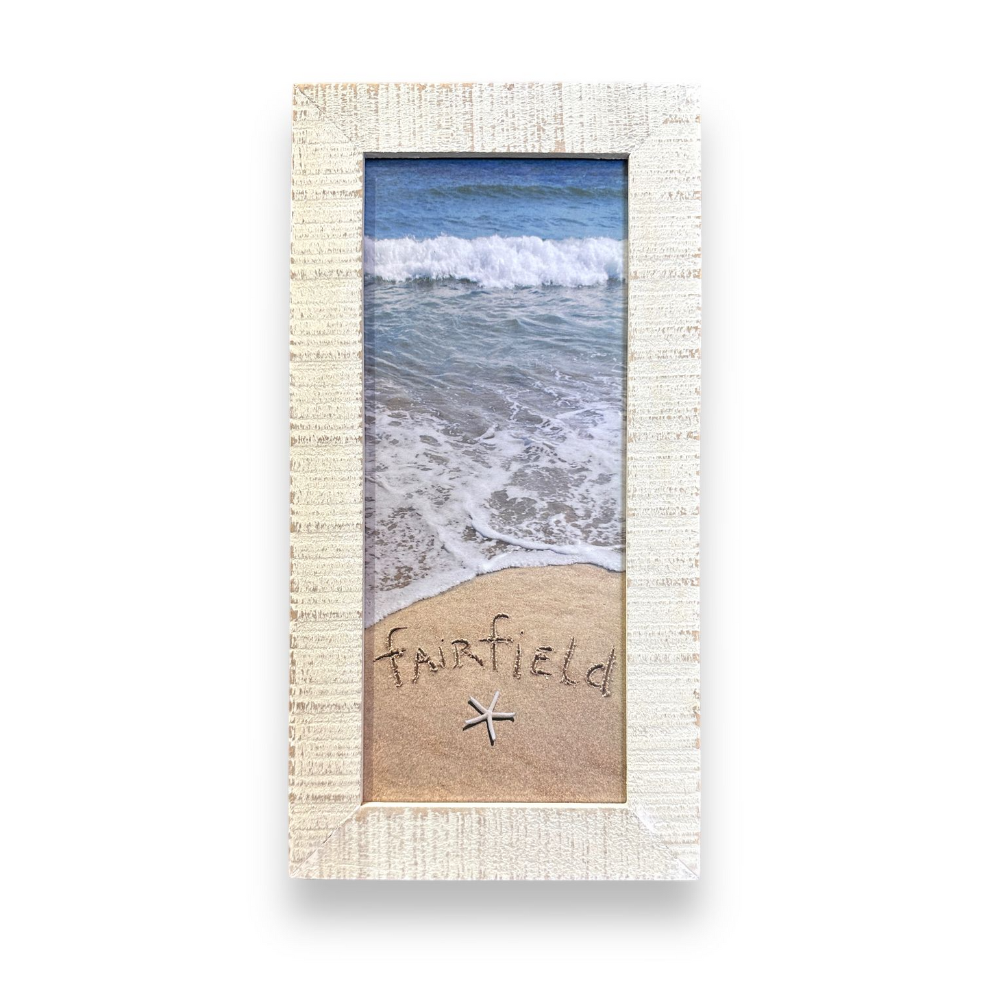 - Summer inspired beach images created with drawn/ scribed message in beach sand, photographed and then framed