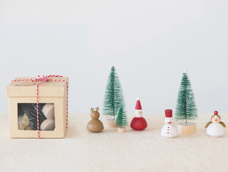 - This festive hand painted Christmas garden set comes with three bottle brush trees and hand painted figures of Santa, a reindeer, a snowman, and a Christmas angel