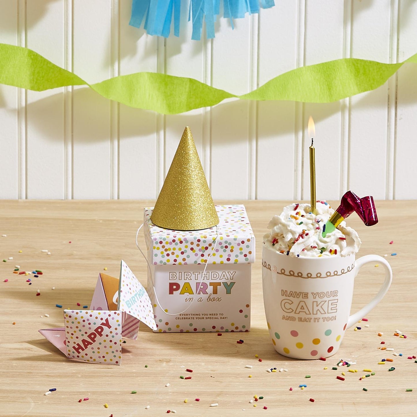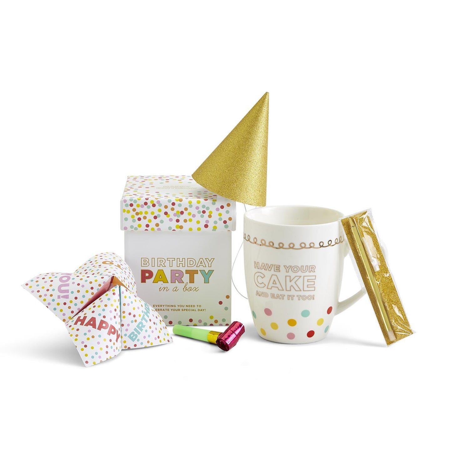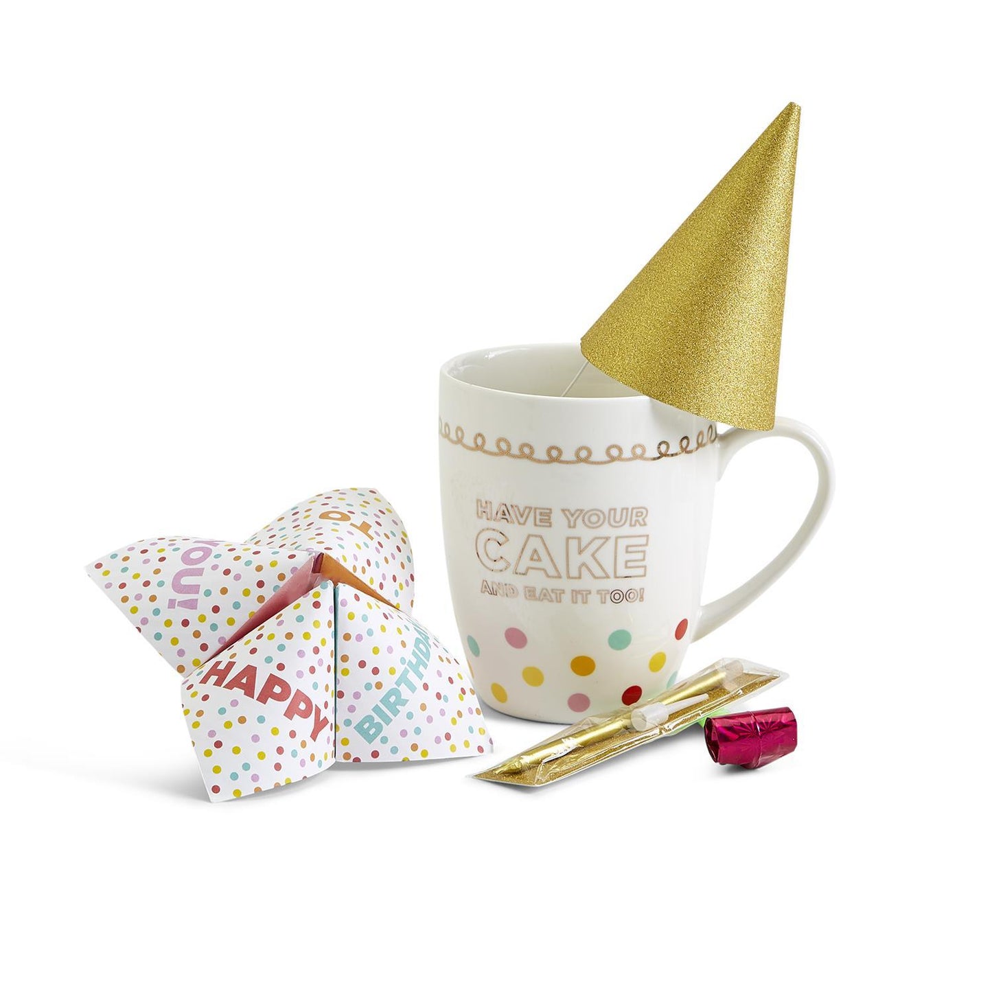 - This party-perfect all-in-one gift package comes with a stylish porcelain birthday mug, paper party hat, fortune teller for future predictions, noise maker for added fun, and a birthday candle to make their cake positively sparkle.