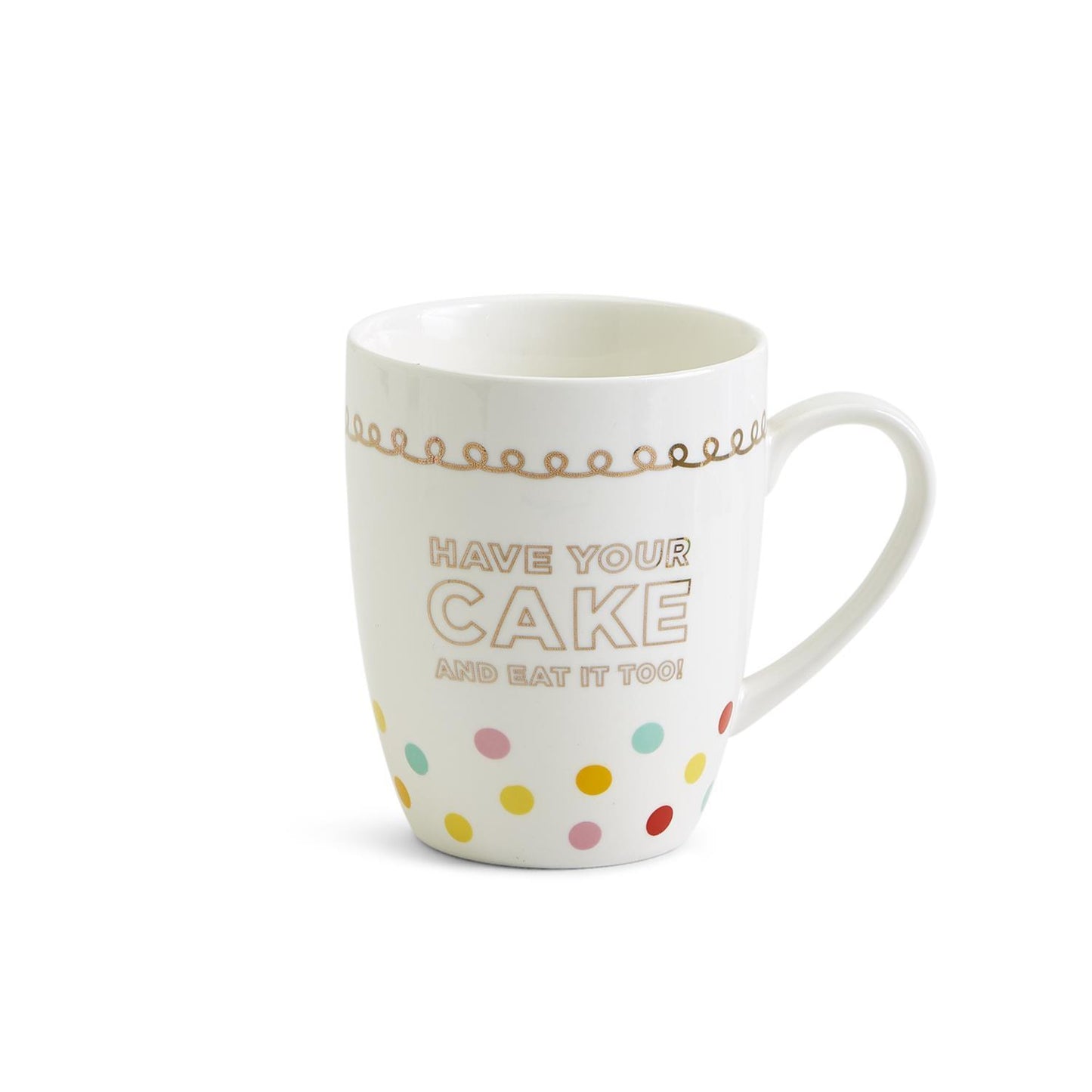 - Mug is decorated with fun print and caption, "Have your cake and eat it too!"