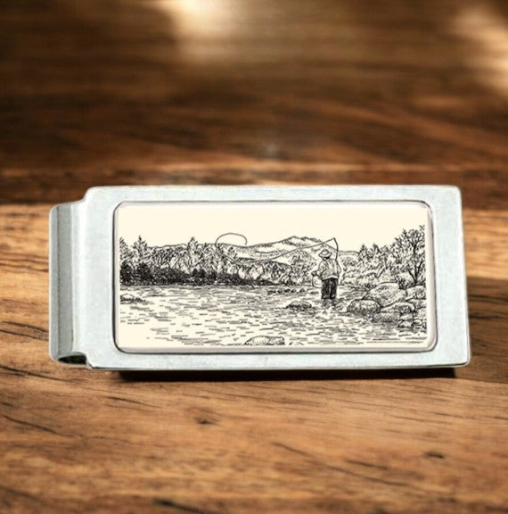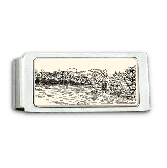 - Perfect for the adventurous outdoorsman, our Fisherman hinged money clip is crafted with sleek porcelain and durable stainless steel.