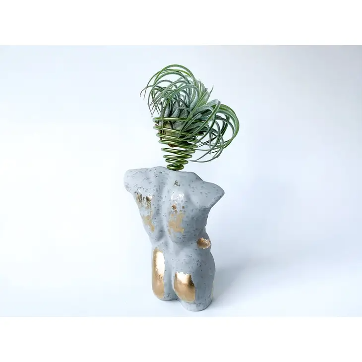 - Planter comes in the shape of a male body and is topped with an adjustable floral wire.
