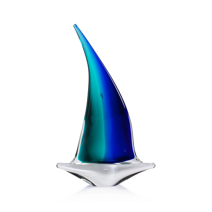 - This sailboat is made of glass and is available in blue or amber multicolor tones.
