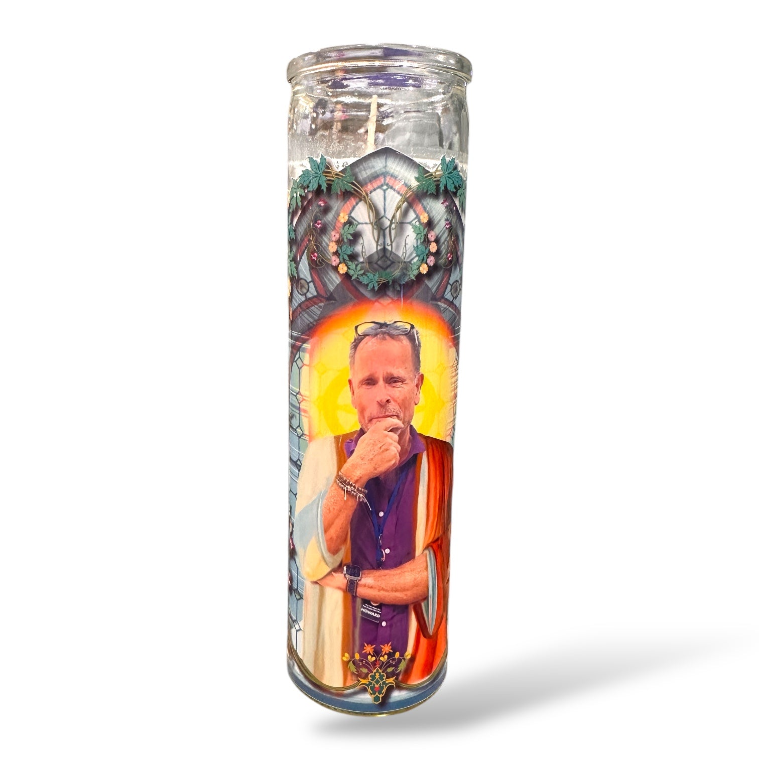 - This standard size prayer candle is unscented and in a glass vessel with the image of you know who, seemingly trying to pass himself off as a saint.