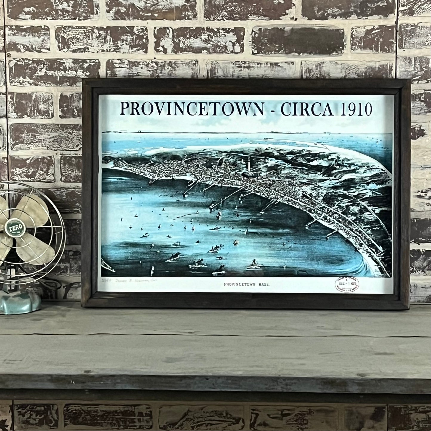 - Shadowbox framed in dark brown reclaimed wood with print on front glass that reads "Provincetown - Circa 1910"