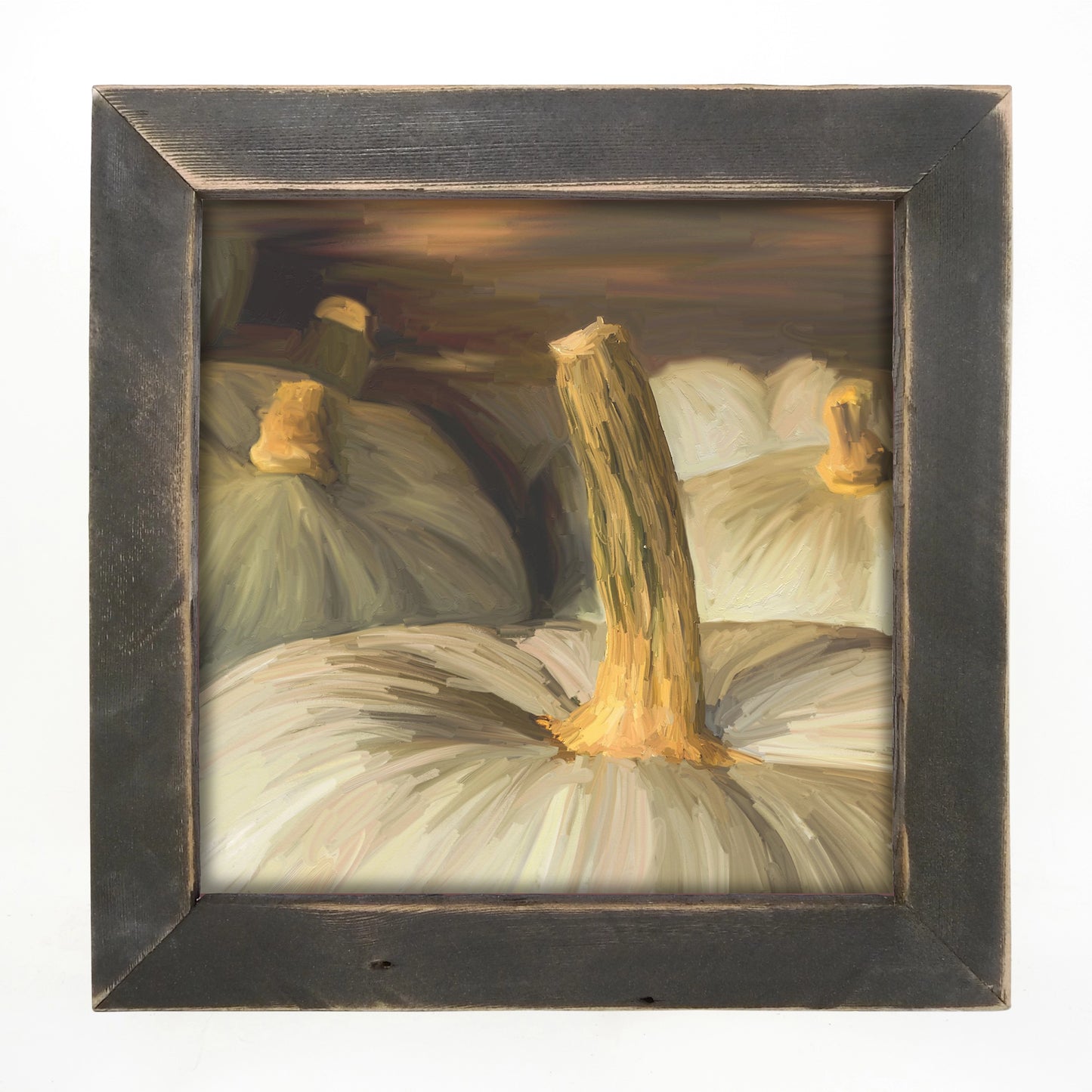 - This close-up image of pumpkins is framed in a distressed black frame from upstate NY.