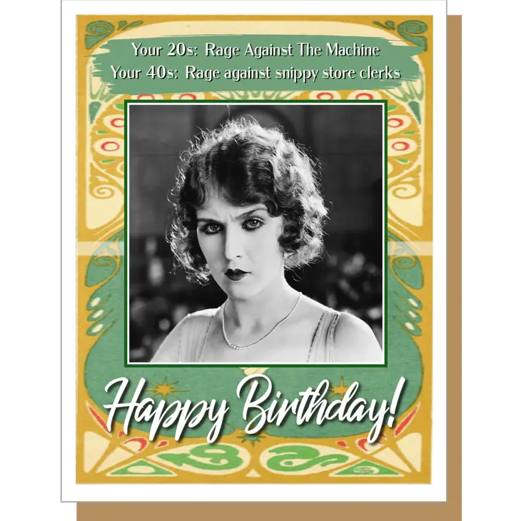 - Your 20's: Rage against the machine. Your 40's Rage against snippy store clerks. Happy BIrthday!